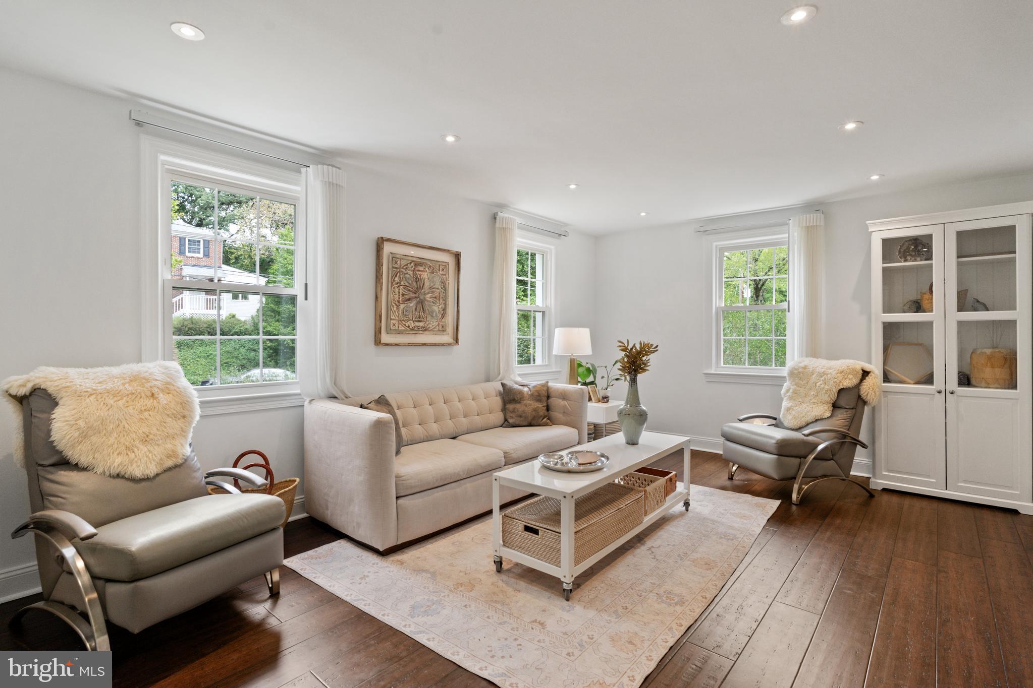 Welcome to 7202 Hilton Avenue - this thoughtfully expanded and beautifully remodeled colonial, nestled in a friendly and sylvan Between-the-Creeks location, just steps to playgrounds, parks and streams to idle by, is a rare find in terms of comfort, design, and sheer space, combining sun-drenched rooms, LED lighting, lofty ceilings, wood flooring, exquisite marble accents, shiplap walls, and a charming farmhouse flair--not to mention an outstanding primary bedroom suite! The main level features a light-filled living room, an open dining area that flows seamlessly into the amazing chef's kitchen, and a convenient mudroom/laundry room that opens to the screened porch. The gourmet kitchen is a chef's dream, boasting a Bosch stainless steel appliance suite, gorgeous quartz counters, a large...