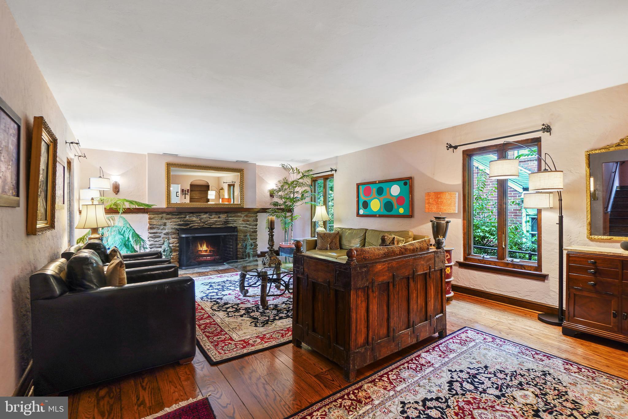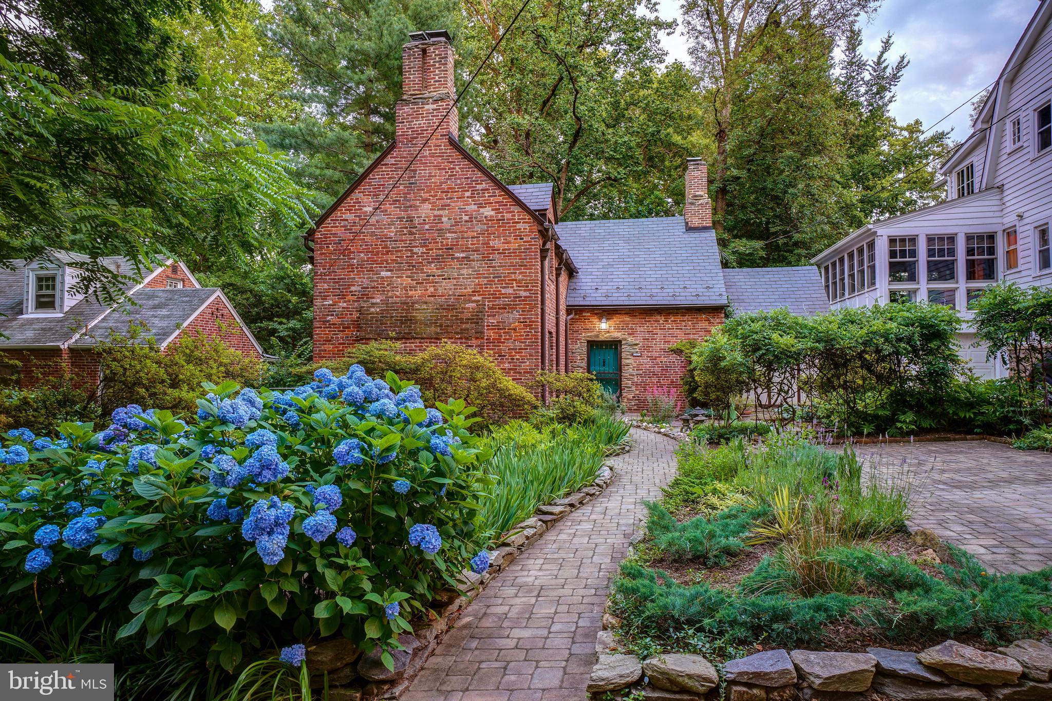 Straight out of a storybook! This enchanting brick and stone Tudor exudes a spacious and magical charm, perfectly situated on a beautiful block just steps from the Metro. Setting the tone for this home is a picturesque 12,600 square foot lot adorned with gorgeous plants, vibrant flowers, and a beautiful brick paver entry with flourishing flower beds. Built in 1933, this residence masterfully combines old-world charm with modern convenience.Spanning three levels, the home features original architectural details such as glass French doors, dazzling hardwood floors, two fireplaces, glass doorknobs, sconce lighting, and elegant chandeliers. The warm and inviting entry foyer leads to an oversized living room with a stone fireplace and arched built-in display shelving. Beyond the living room, you'll find a tasteful dining room with two corner China cabinets and a tranquil sunroom with walls of casement windows offering bucolic views of the backyard. The kitchen, accessible through striking French doors from the dining room, is a chef's delight. It boasts exquisite quartz counters, a stainless-steel Wolf range with a built-in griddle and exhaust hood, a Sub-Zero refrigerator, a Bosch dishwasher, recessed lighting, handsome cabinetry with soft-close drawers, vaulted ceilings, an exposed brick accent wall, and access to the serene rear terrace. The kitchen has been expanded and reconfigured into an "L" shape, creating a large and functional space for entertaining and cooking. Conveniently located off the kitchen is a powder room with a laundry area.The second level includes three bedrooms, a renovated bathroom, and incredible closet and storage space. The light-filled lower-level surprises with beautiful wood tile flooring, recessed lighting, and abundant natural light. This level includes a bright, versatile sitting room with a large picture window, and a stylish bathroom with a quartz vanity and a glass-enclosed shower featuring a bench and recessed nook. The romantic primary bedroom on this level boasts a wood-burning fireplace flanked by custom built-ins, an expansive window, and period lighting. Completing this level is a media room / 5th bedroom with access to the covered rear porch and backyard. The current owners are using the lower level as a sumptuous primary bedroom suite!Outside, you'll find superb thriving gardens, an expansive stone tiered terrace, a covered rear porch, lush plantings, and a woodshed. The fully fenced rear yard offers privacy and a secure space for relaxation and play. Additionally, the property includes private off-street parking.